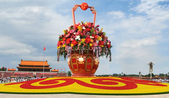 国庆期间,将在天安门广场中心布置“祝福祖国”大型立体花坛,在广场东西两侧绿地、纪念碑、LED灯箱周边,天安门两翼及广场东、西侧路布置花柱、花球及容器花卉。其中,中心花坛以喜庆的花篮为主景,花坛直径50米,花篮最宽处11米,顶高15米。其中中心圆台底座高2米,花篮自身高13米,夜间设有灯光效果。