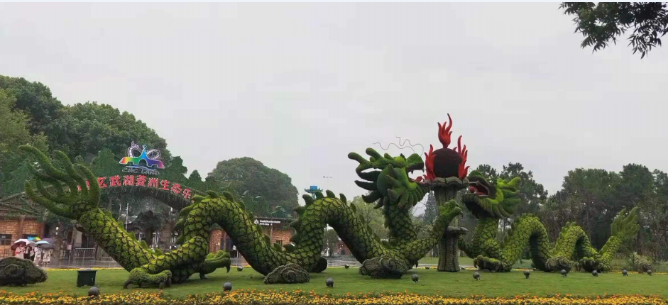 南京玄武湖菱州生态公园双龙戏珠植物绿雕项目